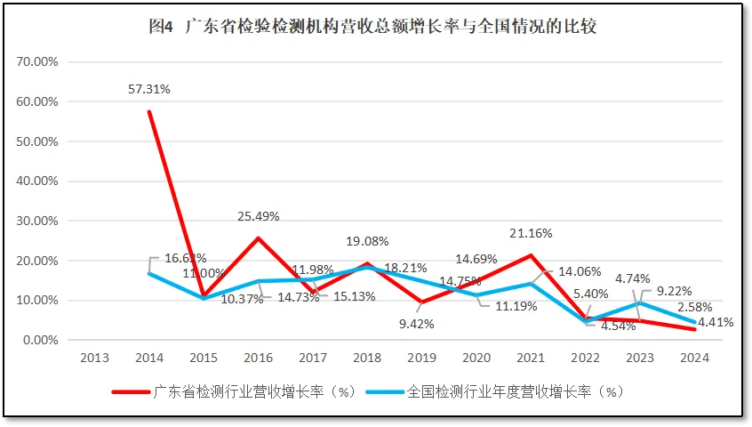 比较广东省检验检测行业年度营收总额增长率与全国检验检测行业年度营收总额增长率,如图4所示。
