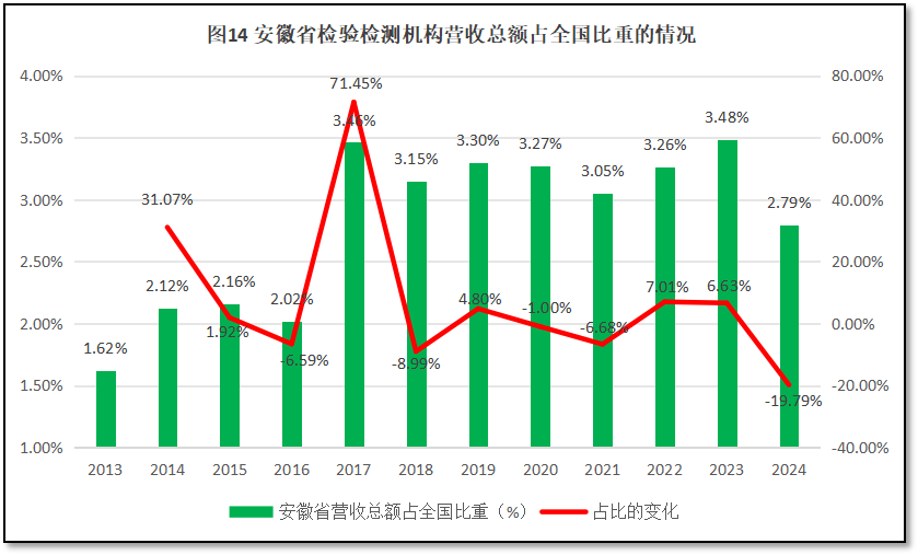 由图14可见,安徽省检验检测机构营收总额在全国检验检测行业营收总额中的比重有两次较大幅度的增长,一次是在2014年前后,占比从1.62%增加2.12%;第二次在2017年,从2.02%增长到3.45%。不过在2017年之后安徽省检验检测机构营收总额的占比变化不大,2023年度的占比为3.48%。2024年,由于营收总额大幅度下降,安徽省检验检测机构营收总额占比下降幅度较大,占比回落到2.79%,是2017年以来的最低水平。从增长率曲线来看,2016年之前安徽省检验检测机构营收总额增长率逐年下降,到2016年增幅为-6.59%,出现负增长。2017年安徽省营收总额的占比出现了一个显著增长的高峰,增长率达71.45%。但此后又大幅度回落。2024年,占比增长率下降达-19.78%,是历年下降幅度最大的一次。