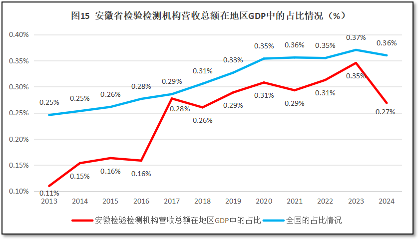 从图15可见,除了2017年增长幅度大一些之外,过去10年安徽省检验检测机构营收总额在当地GDP中的占比缓慢增长,到2023年占比达到0.35%的峰值,但2024年度下降幅度很大,回落到0.27%,是2017年以来的最低值。12年来,安徽省检验检测机构营收总额在GDP中的占比曲线一直低于全国平均数,2024年两者的差距还进一步拉大。这说明安徽省检验检测行业发展不够稳定,在2024年度规模、效益“双下滑”的情况下,安徽省检验检测行业在本地经济版图中的地位和贡献进一步下降,需要引起当地同行关注。