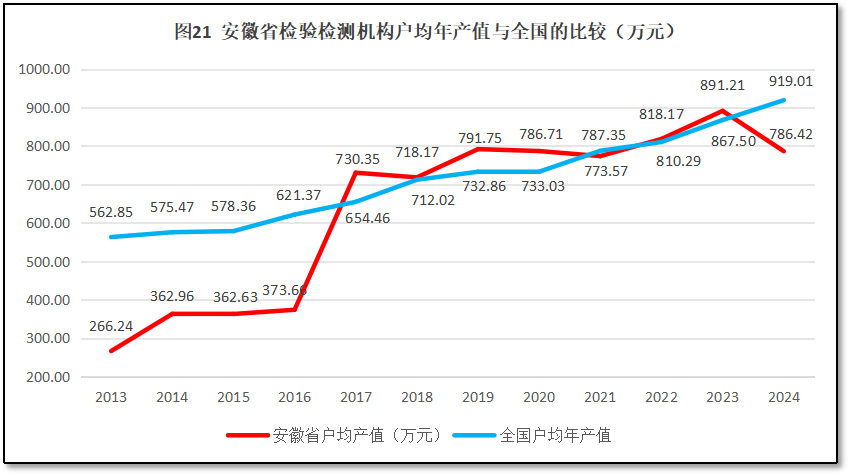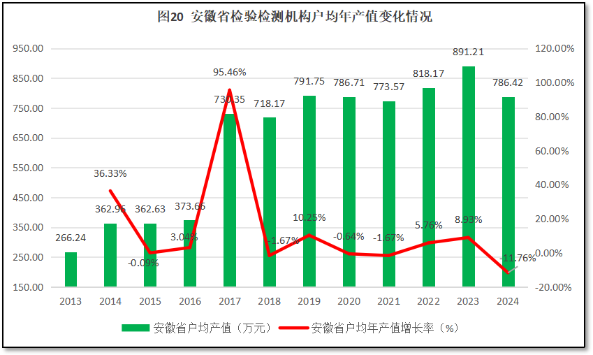 由图20可见,2014年,安徽省检验检测机构户均营收从2013年的266.24万元增长到360万元左右,之后就停止了增长,直到2017年,忽然出现了一个巨量的提升,达到730.35万元。在此之后,又停止了增长,一直在700多万元徘徊。到2022年之后,户均营收突破800万元,并持续增长,2023年达到了891.21万元的峰值,但2024年出现较大回落,仅有786.4万元,较2023年度净减少约104.8万元。从增长率的曲线来看,除了头两年数据误差以及2017年的巨量增长导致平均增长率很高之外,2023年之前,安徽省检验检测机构户均年产值其他年份的同比增幅总体平稳,但2024年出现了-11.74%的巨大降幅,成为历年下降幅度最大的一次。