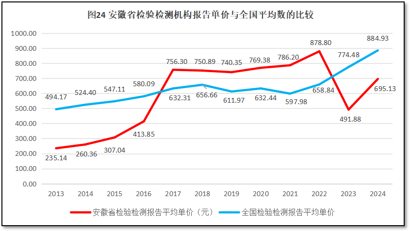 由图24可见,在2022年之前,安徽省检验检测报告的单价持续增长,在2017年左右出现较大增幅并超过全国平均数,此后数年一直领先于全国平均水平。到2022年,安徽省检验检测机构的报告单价达到878.80元的峰值,比同期全国平均数高出220元。不过,2023年-2024年,安徽省检验检测机构报告单价出现大幅下降,连续两年低于全国平均数,低出近200元/份。