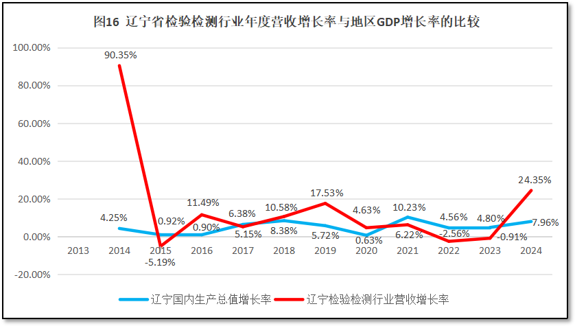 由图14可见,辽宁省检验检测机构营收总额在全国检验检测行业营收总额中的比重在2014年达到3.4%的峰值后,就一路走低,逐年下降。到2023年占比仅有1.84%,是历年来的最低点。2024年有所反弹,回升到2.19%。从增长率曲线来看,刨除2014年异常数据之外,在多数年份均为负增长,仅在2019年出现2.42%、2024年出现19.1%的两次正增长。这一曲线表明,辽宁省检验检测行业由于发展缓慢,营收不足,在全国的地位逐年下降,但这一下降势头在2024年有所缓解。